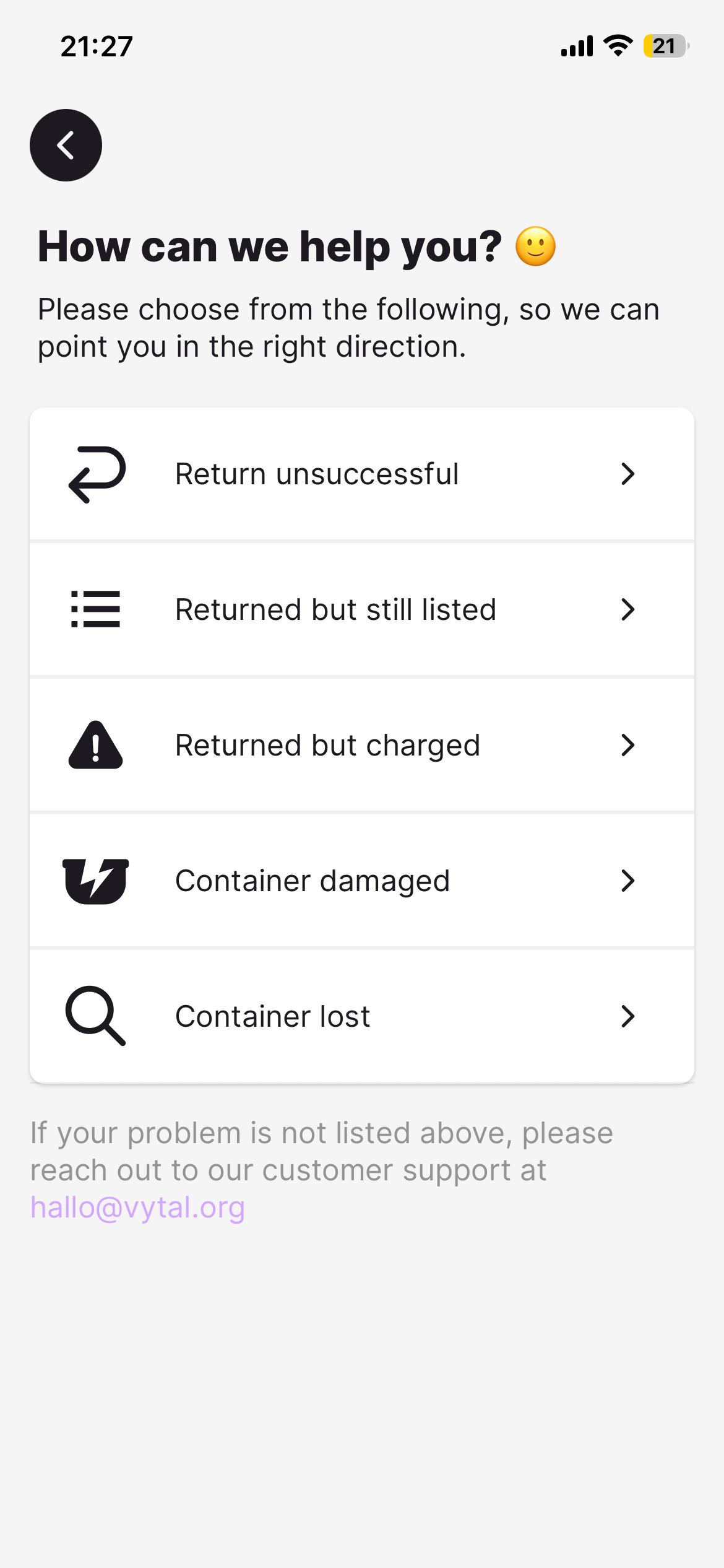 If you borrowed the container without the app by tapping your bank card (Tap2Borrow), refunds are unfortunately not possible. Since the borrowing is anonymous, we cannot trace the transaction. However, if you download the Vytal app and register, we can enable refunds in such cases.